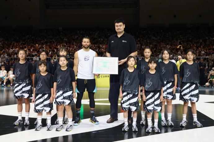 10名来自四川山区学校的小球员向姚明和库里赠送了一份特殊的礼物——一幅由热爱篮球的四川小姑娘们共同创作的画作。姚明和库里也宣布,将联手实施公益计划,支持中国乡村地区青少年女子篮球发展。