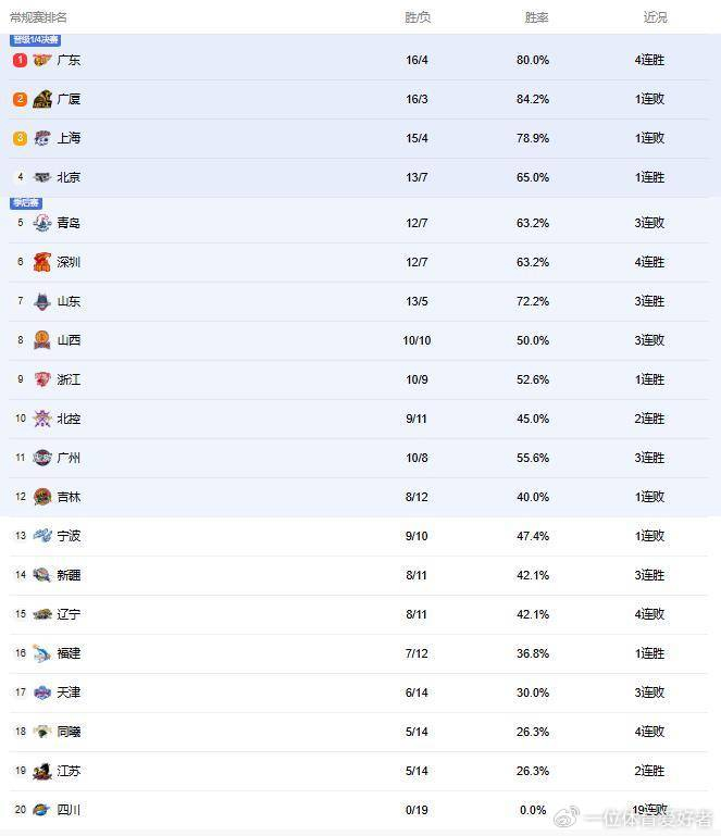 战胜天津后,广东逆袭广厦暂时冲到联盟第1位。